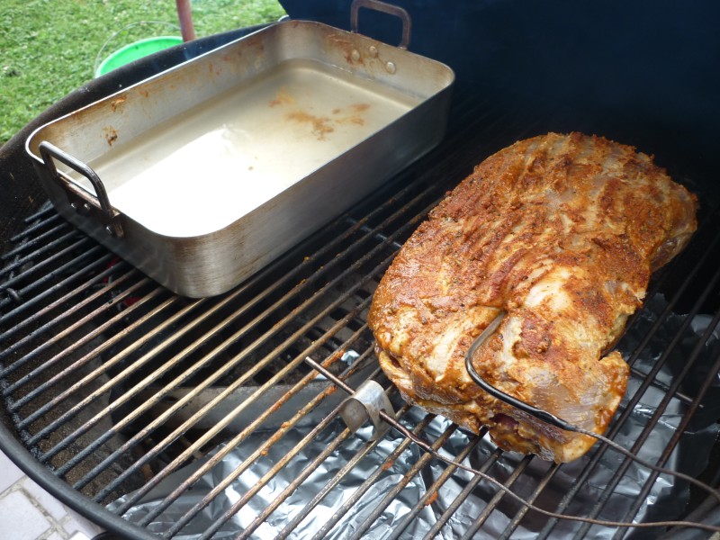 Am nächsten Morgen wurde der Kugelgrill auf etwa 120°C eingestellt und der Nacken um etwa 8.45 Uhr aufgelegt. Eine Aluschale mit Wasser kam dazu (die sorgt für ein feuchtes Klima in der Kugel und hält die Temperatur etwas stabiler):