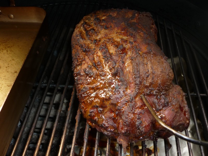 Nach etwa 4 Stunden bei 120°C (zwischendurch sollte die Wasserschale aufgefüllt und eventuell Kohle nachgelegt werden) sieht der Nacken schon recht gut aus und hat eine Kerntemperatur von 76°C