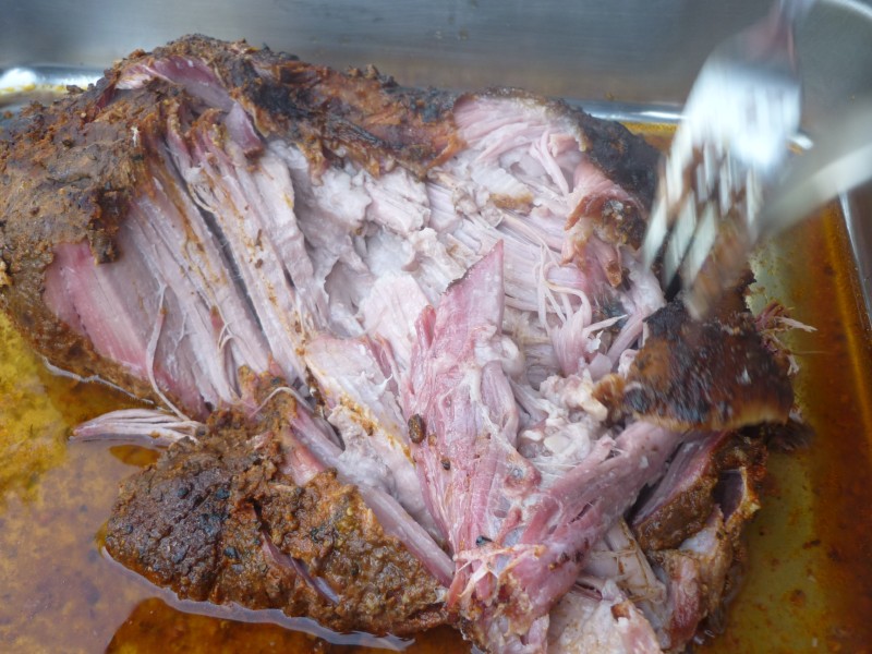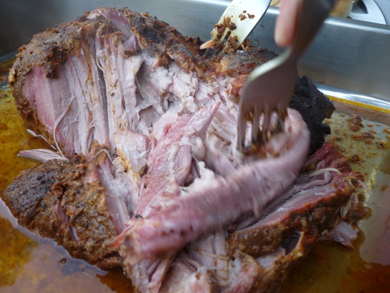 Gegen 17 Uhr wäre das Fleisch eigentlich schon 'gar' gewesen (genaugenommen ist ein Pulled Pork sowieso ein übergarter Schweinebraten), aber es sollte erst um 19 Uhr gegessen werden. Also ein wenig warmhalten...