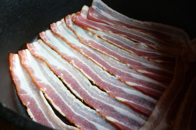 Als erstes wird der Dutch Oven mit den Baconstreifen ausgelegt