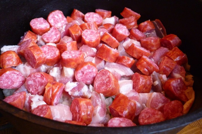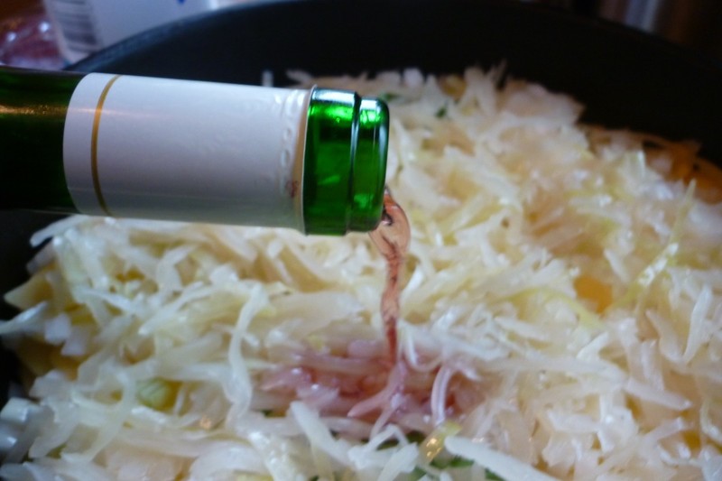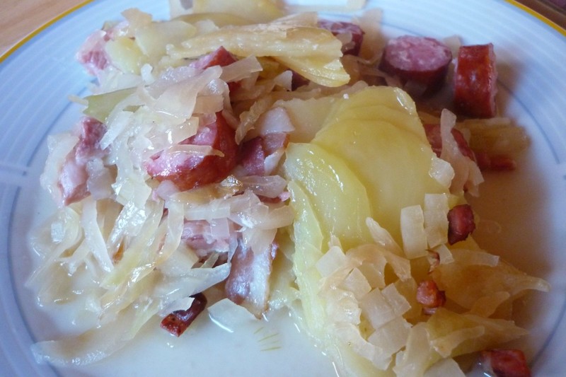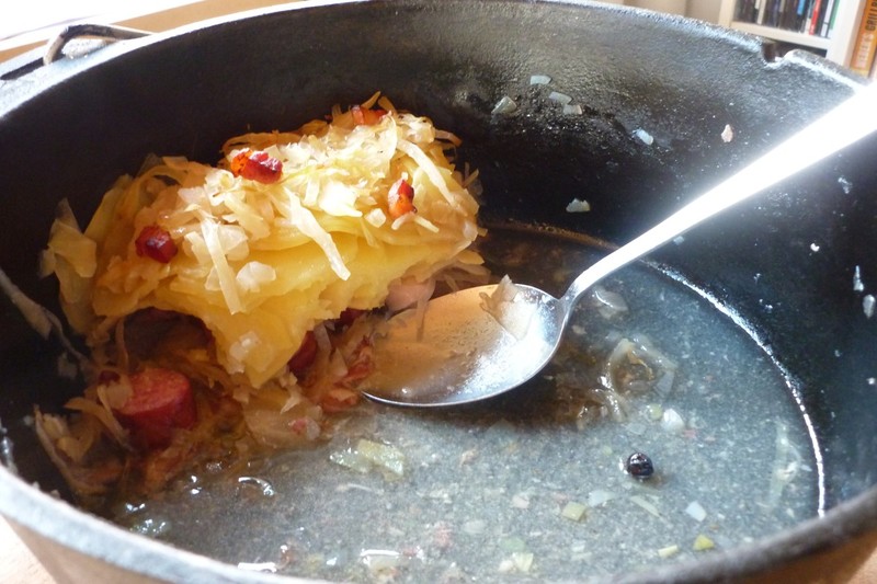 Schon länger hatte ich das Rezept für Choucroute Strasbourg markiert, da ich noch 500g selbstgemachtes Sauerkraut hatte. Zudem war eine Zubereitung im Dutch Oven problemlos möglich.