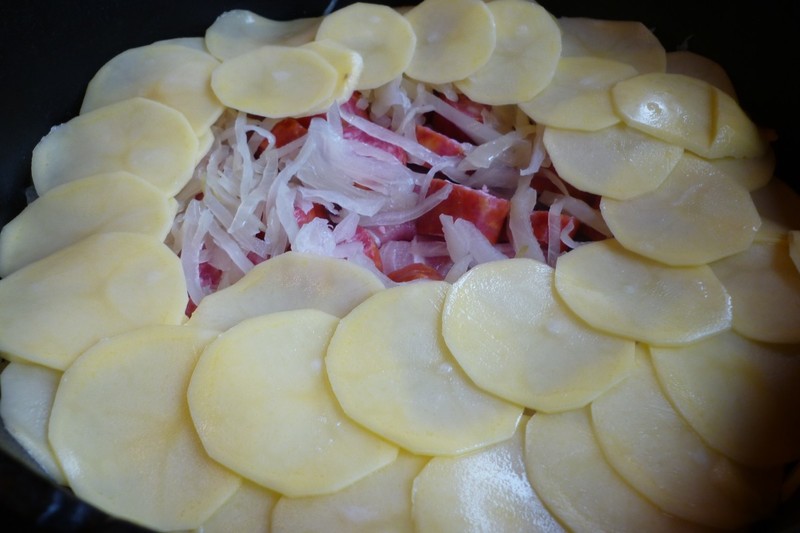 auf die Mettwurst wieder 1/3 vom Sauerkraut und darauf die in dünne Scheiben gehobelten Kartoffeln
