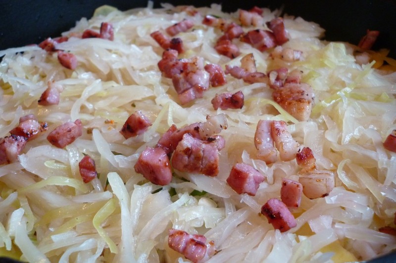 den Abschluss bildet wieder eine Schicht aus den restlichen Zwiebeln, Gewürzen und Sauerkraut