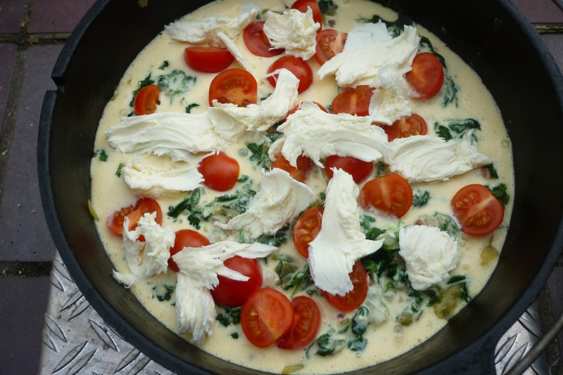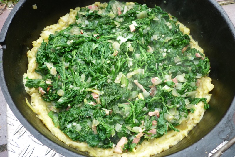 Der Spinat darf nun ein wenig dünsten. In der Zwischenzeit wird die Röstimasse in einem 10er Dutch Oven verteilt