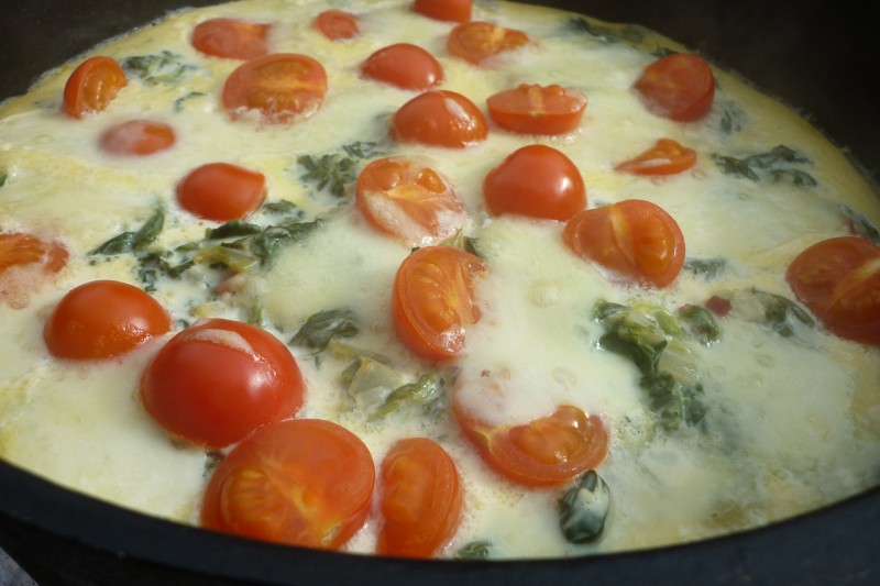Die Fetacreme, die mit Pürierstab aus 150g Feta, 2 Eiern, etwas Milch, etwas Salz und Pfeffer gemixt wurde, hätte eigentlich vorher mit dem Spinat vermischt werden sollen. Das hatte ich vergessen und die Creme einfach über den Spinat gegossen. War nicht weiter schlimm, werde ich beim nächsten Mal aber anders machen.