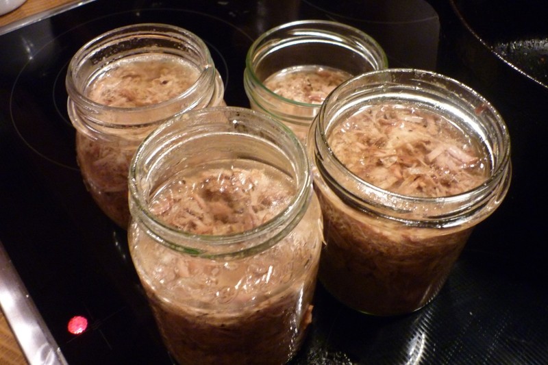 Das Fleisch wird nun in Gläser abgefüllt und mit dem abgeschöpften Fett übergossen