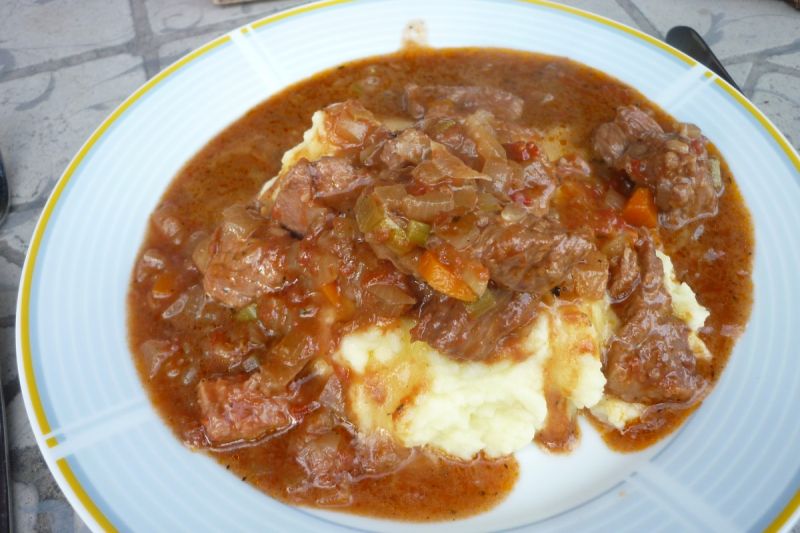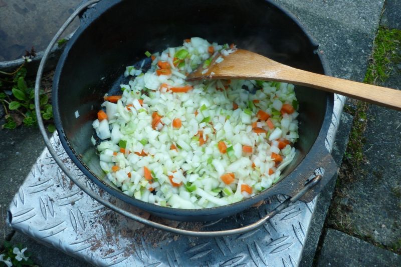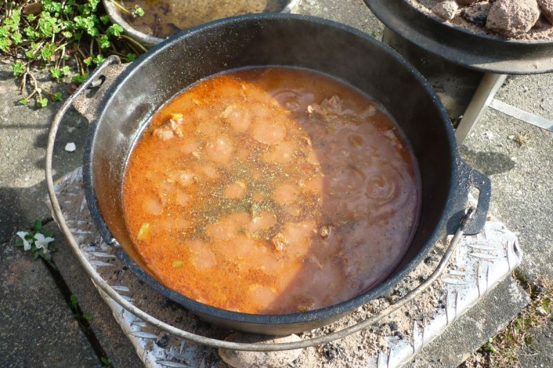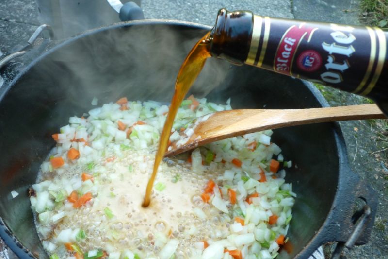 Das Porter hat einen sehr angenehmen, malzigen Geschmack beigetragen. Ein wenig länger hätte das Gemüse noch simmern können, aber leider gingen am Anfang die Kohlen aus. Die Zwiebeln müssen bei so einem Gericht eigentlich komplett zerfallen, damit sie dem Ganzen eine gute Bindung geben.